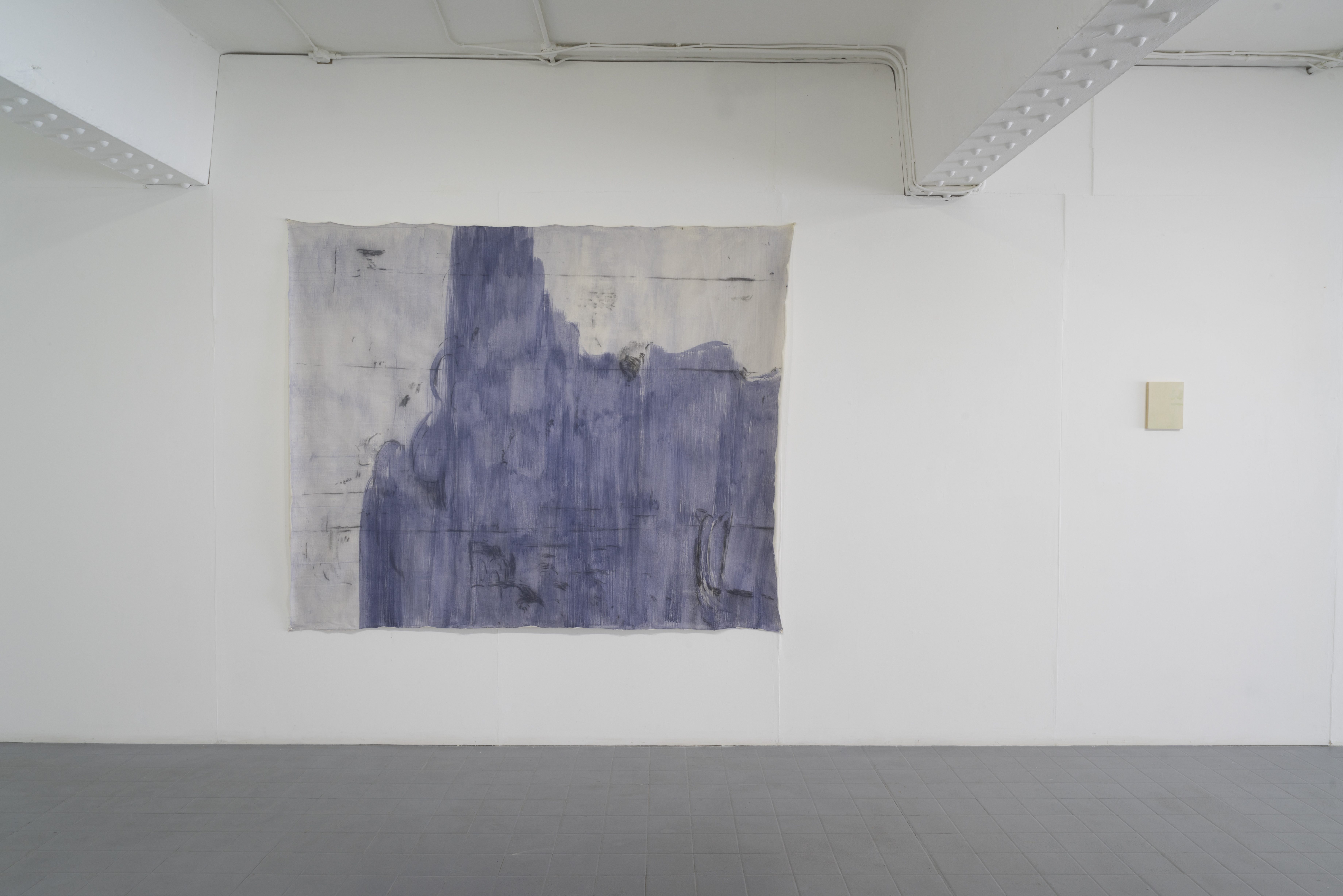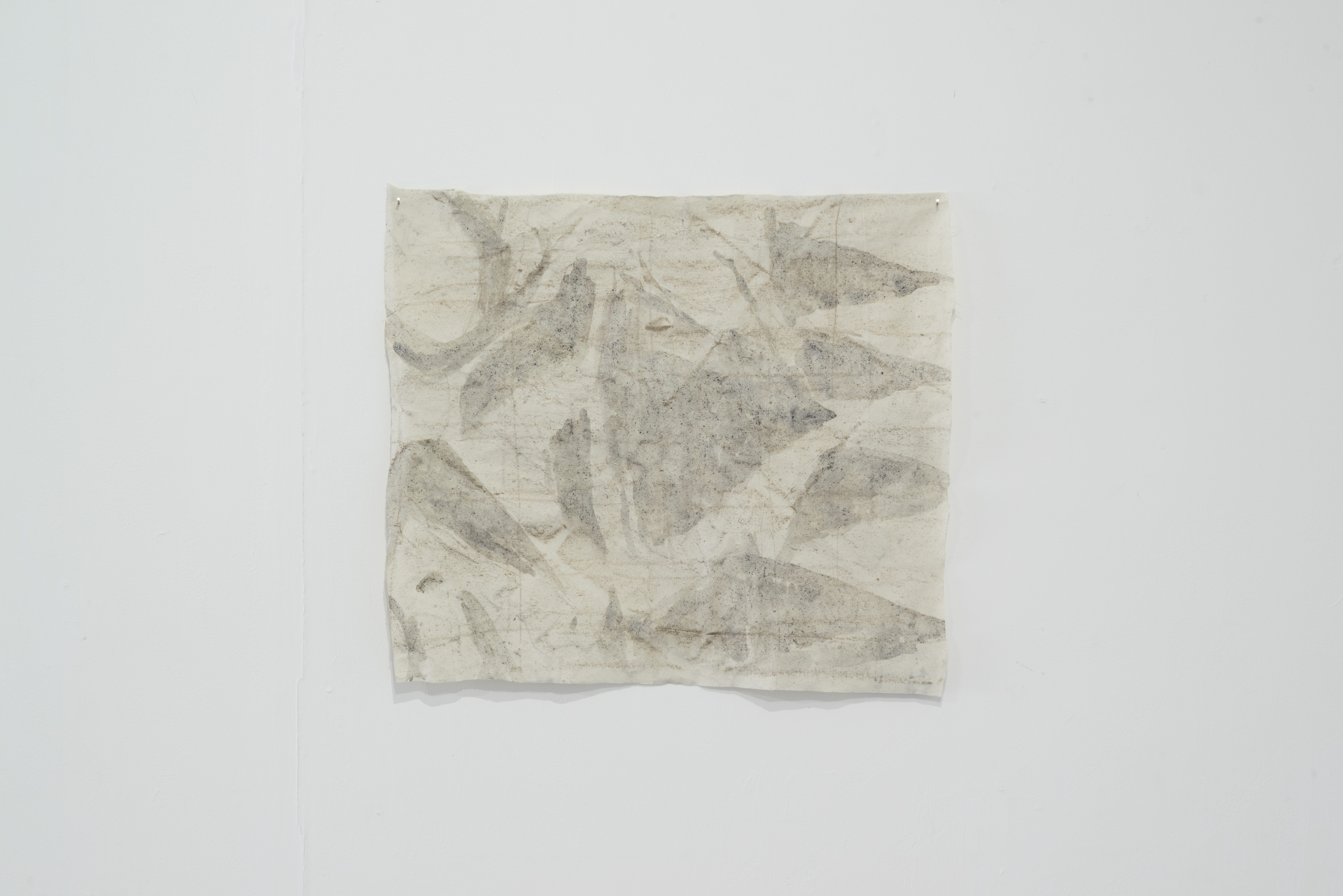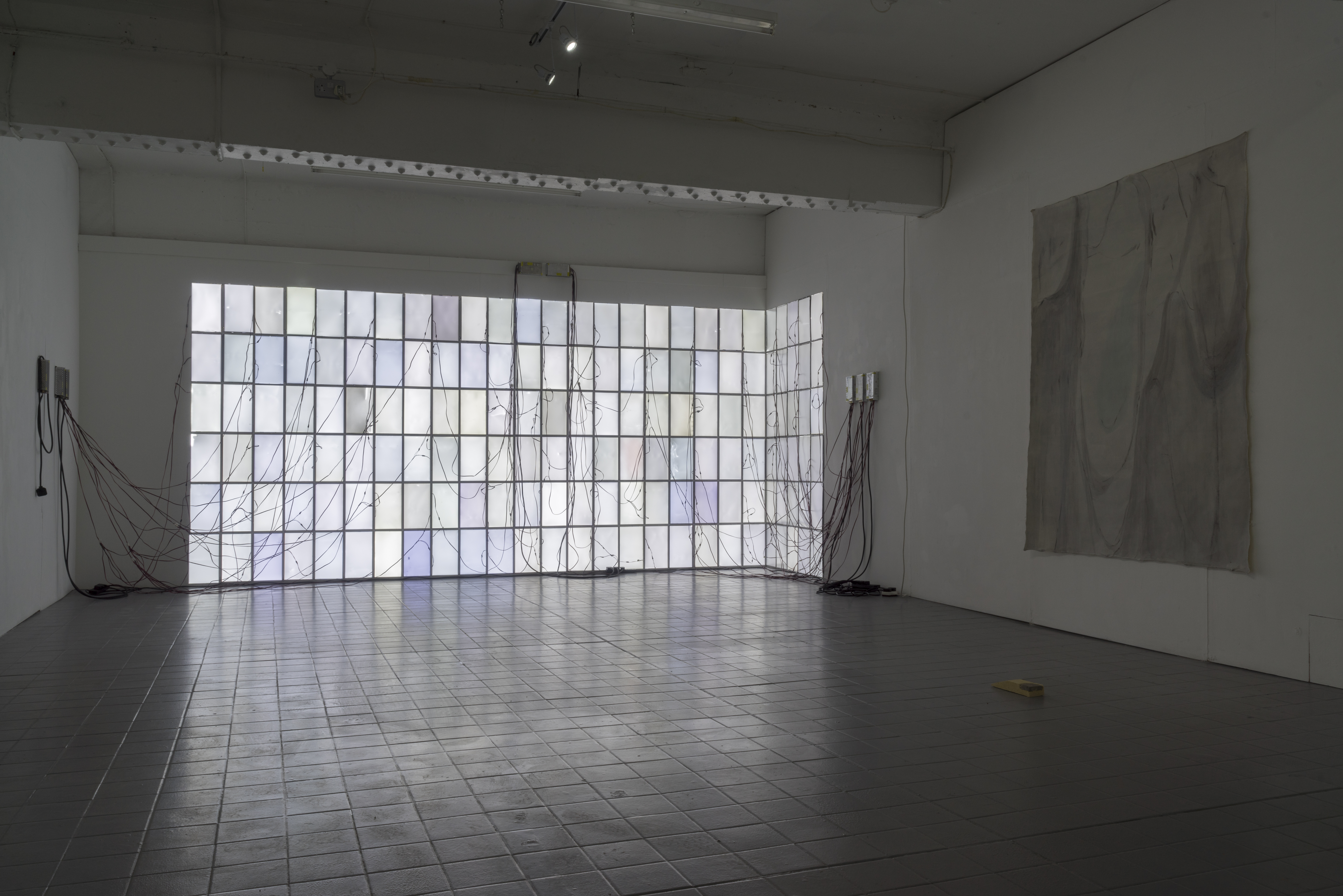 BLANK LIONS refers to the term HIC SVNT LEONES (Here are lions), which was used by Roman and Medieval cartographers when denoting unknown territories on maps. Rather than striving towards eventually discovering and naming unknown locations, the artists seem to be interested in moving towards a state of blankness; erasing that which is unnecessary and allowing space for the presence of something that cannot be named. Subtle stitching on transparent plastic, silent screens void of information, calligraphic marks reminiscent of landscapes and scattered fragments of dusty–coloured cement, suggest that blankness and muteness can be forms of understanding rather than things to be identified.